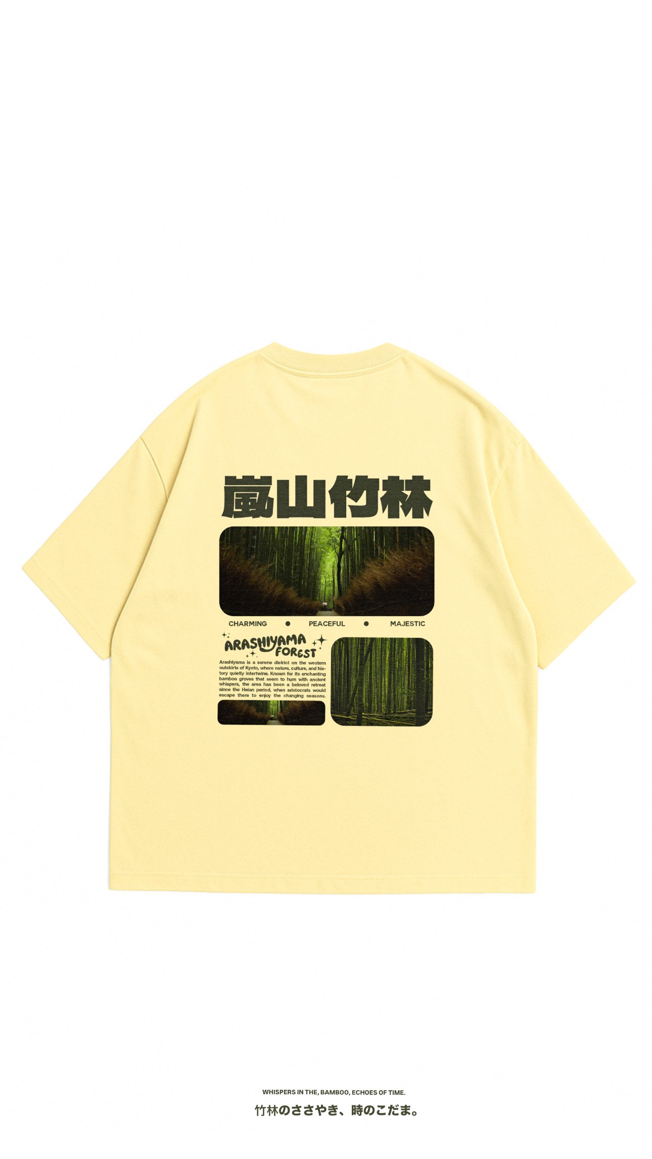 Oversized tee crafted from 320 GSM premium cotton. Featuring the Arashiyama Bamboo Forest graphic in vivid green tones with Japanese text — a bold streetwear piece that balances durability, comfort, and calm design.