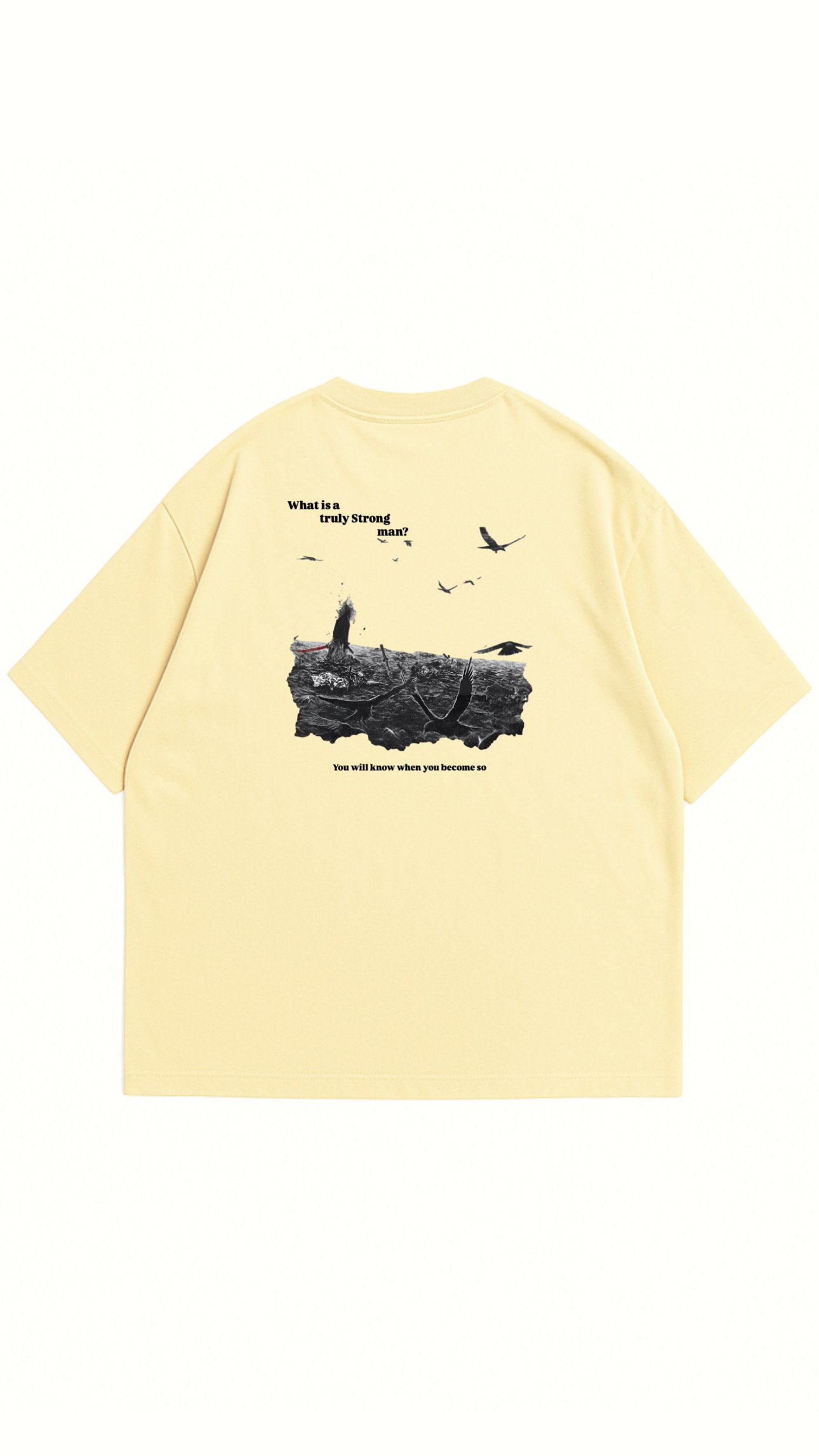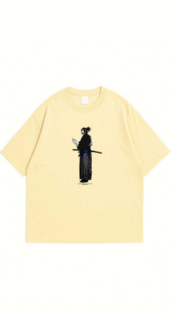 Oversized 260GSM cream beige tee with samurai artwork and quote print. Minimal front design, bold back detail.